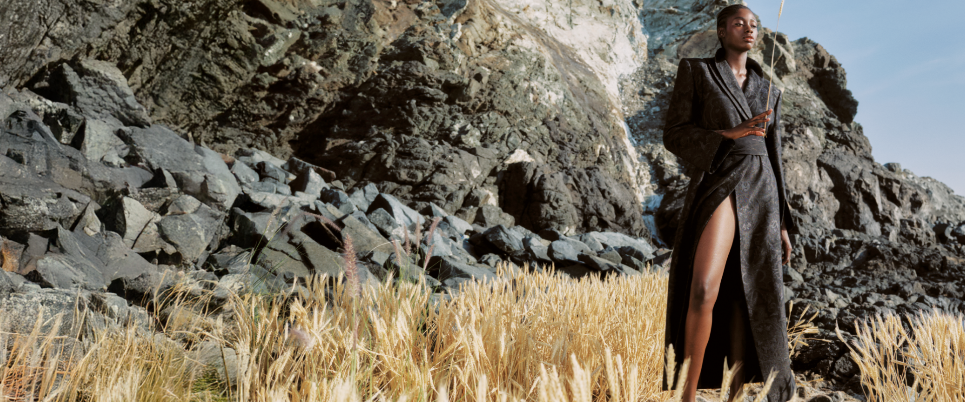 Crafted meticulously from custom-made jacquard fabric, the Splendour Reefer draws inspiration from Demeter. Through its design, the reefer pays homage to Demeter’s association with womanhood and the feminine through its layered collar, with the intricate motifs in the design emerging from vintage Persian carpets. The garment boasts a tailored fit, accentuating the feminine silhouette to create a sense of glory. To emphasise the goddess’ powerful presence, the custom gold-tone belt buckle is centralised in its placement at the root chakra. Able to be styled for a range of occasions, the Splendour Reefer demonstrates its versatility and enhances the graceful femininity of its wearer, providing a regal glow.